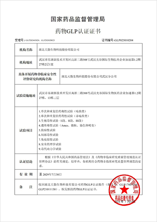 日前,國家藥品監督管理局對湖北天勤生物武漢分公司(以下稱“天勤生物武漢分公司”)執行《藥物非臨床研究質量管理規范》(以下稱GLP)的情況進行了為期1周的定期現場檢查,結果均順利通過。